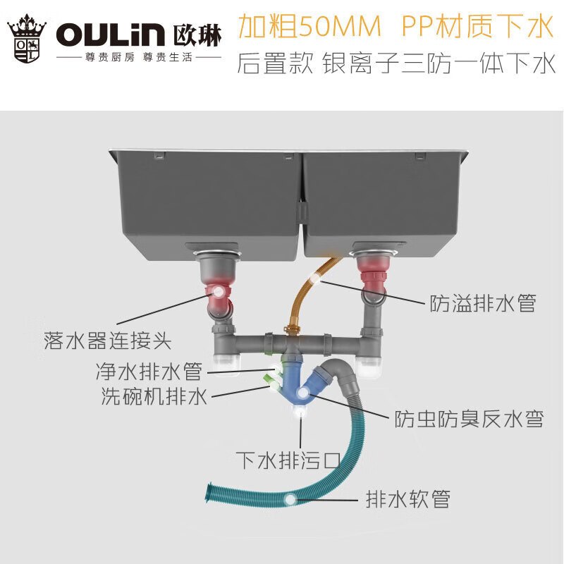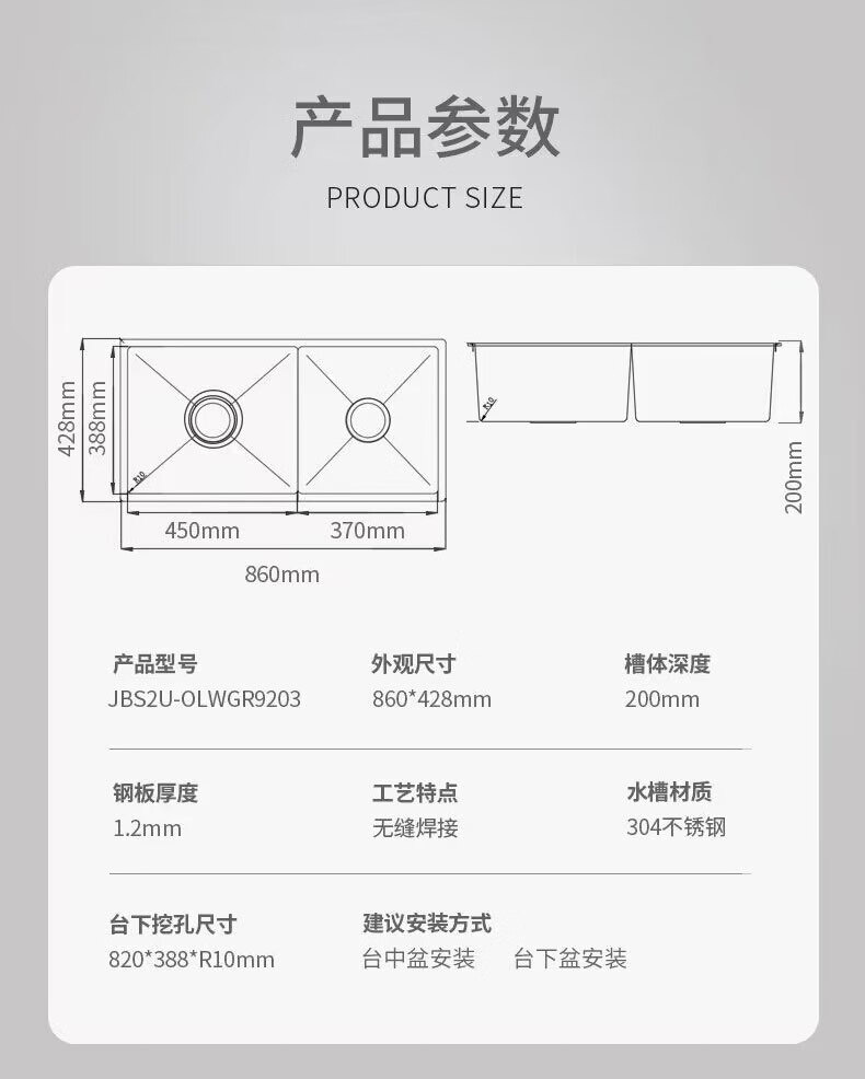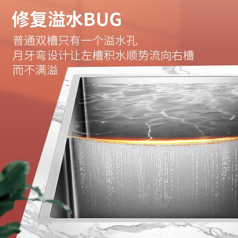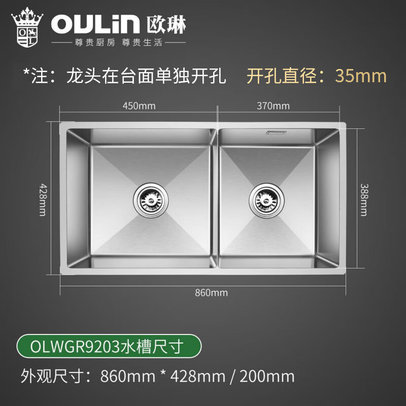 欧琳水槽9203手工水槽大双槽1.2mm304不锈钢双水槽台下盆厨房洗菜盆洗碗池 860mm槽体