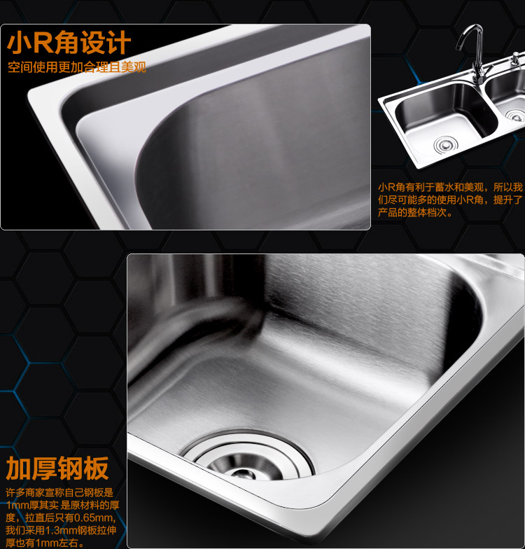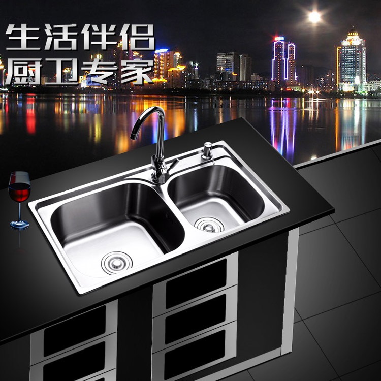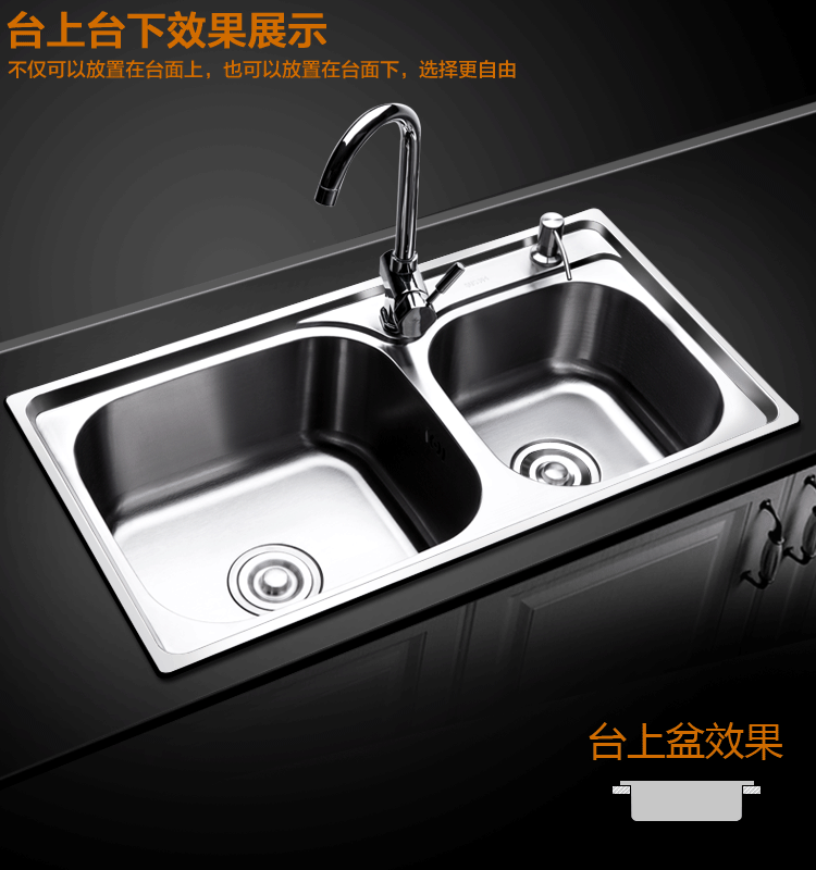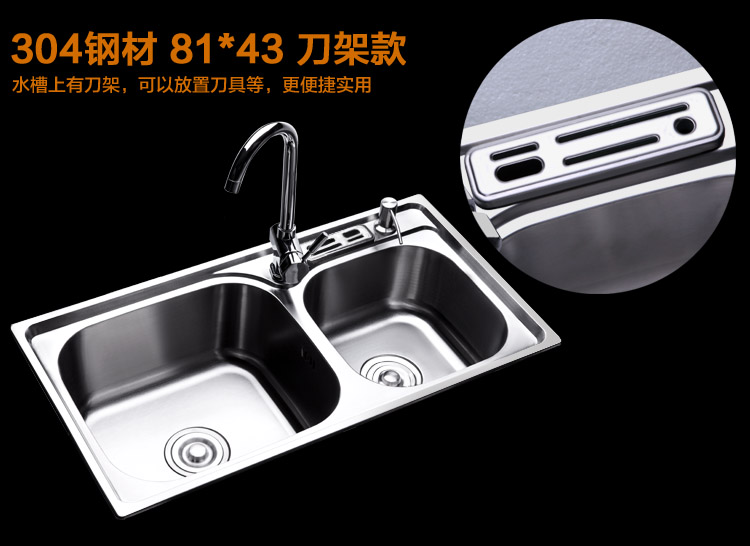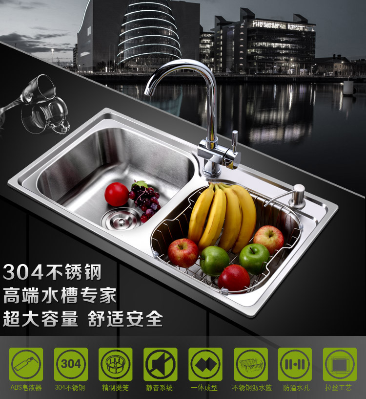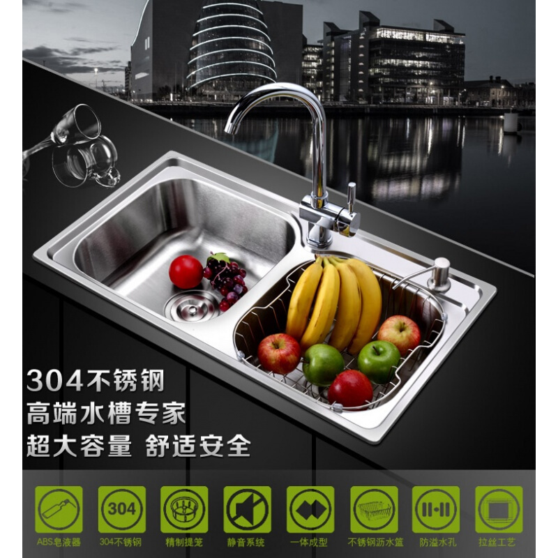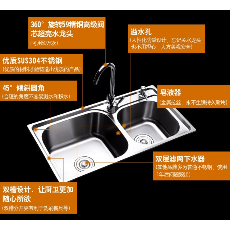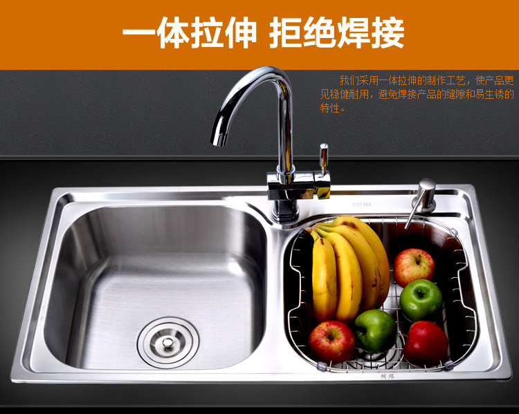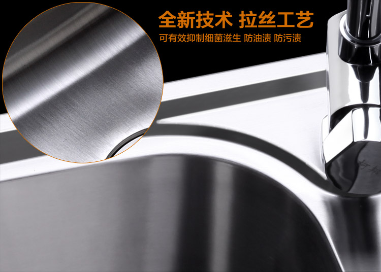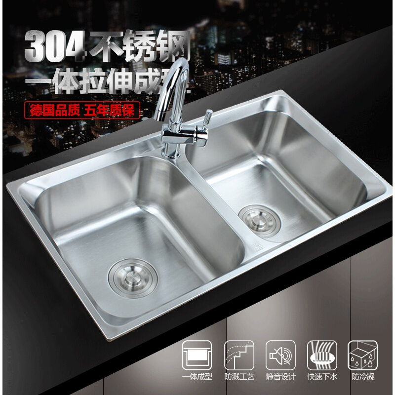 欧琳水槽大双槽一体拉伸304不锈钢水槽厨房洗菜盆洗碗池后置落水孔J006 配001不锈钢龙头