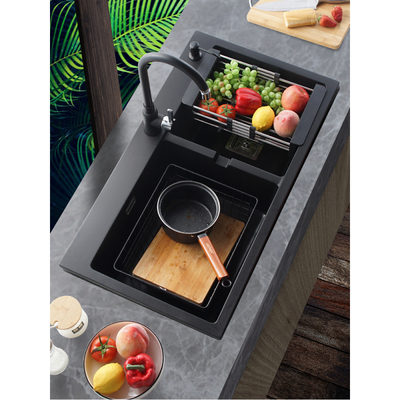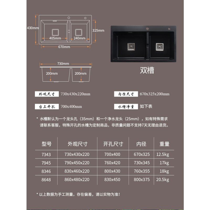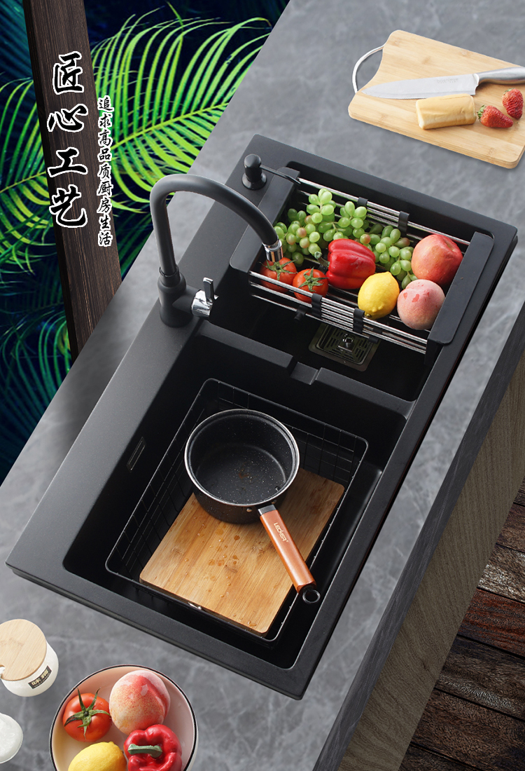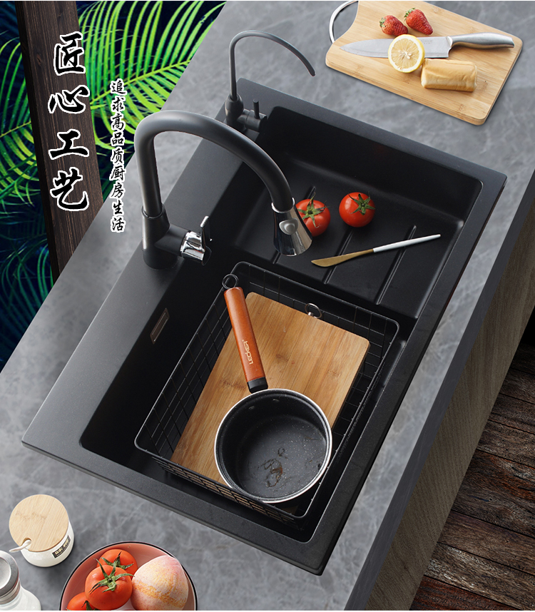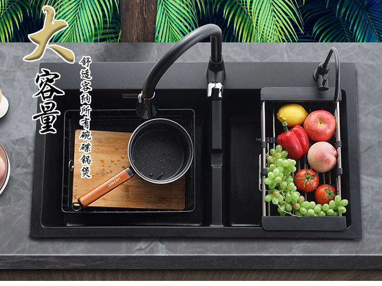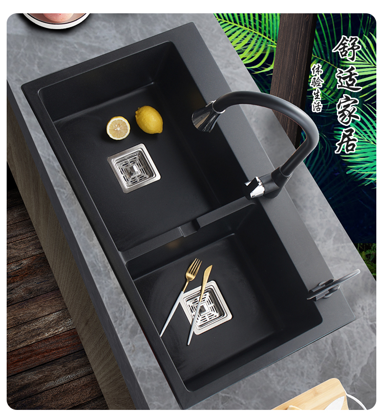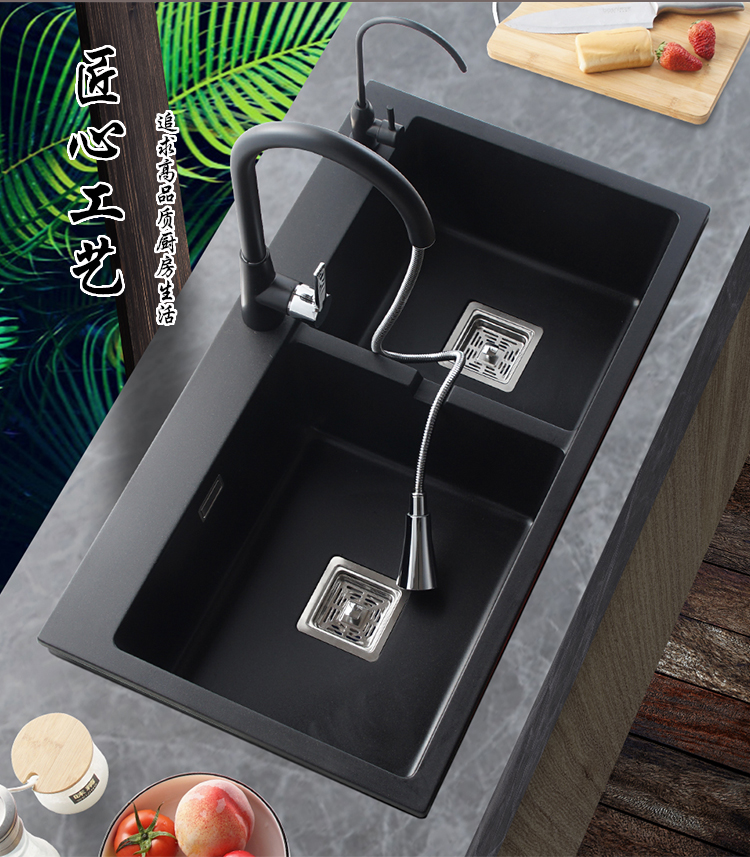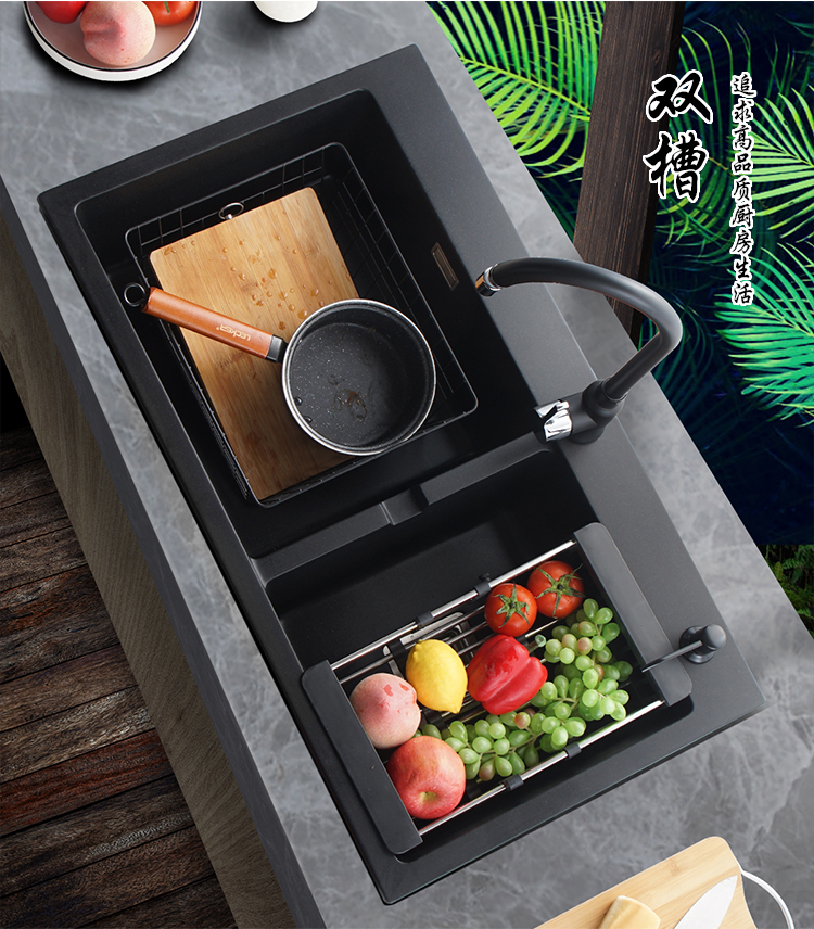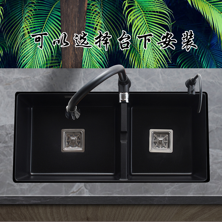 卫浴黑色大双槽石英石水槽厨房水槽洗碗洗菜盆台上台下盆套餐